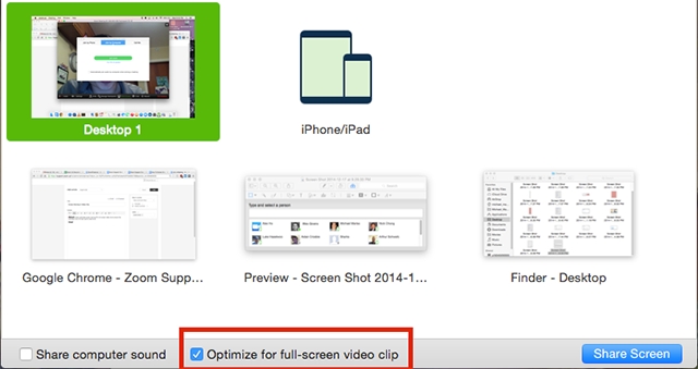 Select the screen you want to share and select Optimize for full-screen video clip.