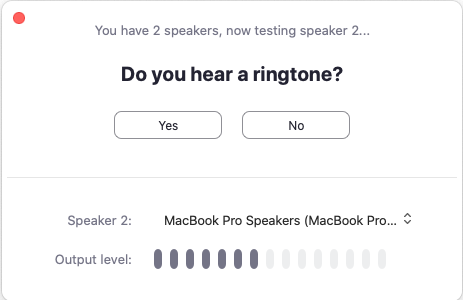 The meeting will display a pop-up window to test your speakers. If you don't hear the ringtone, use the drop-down menu or click No to switch speakers until you hear the ringtone. Click Yes to continue to the microphone test.